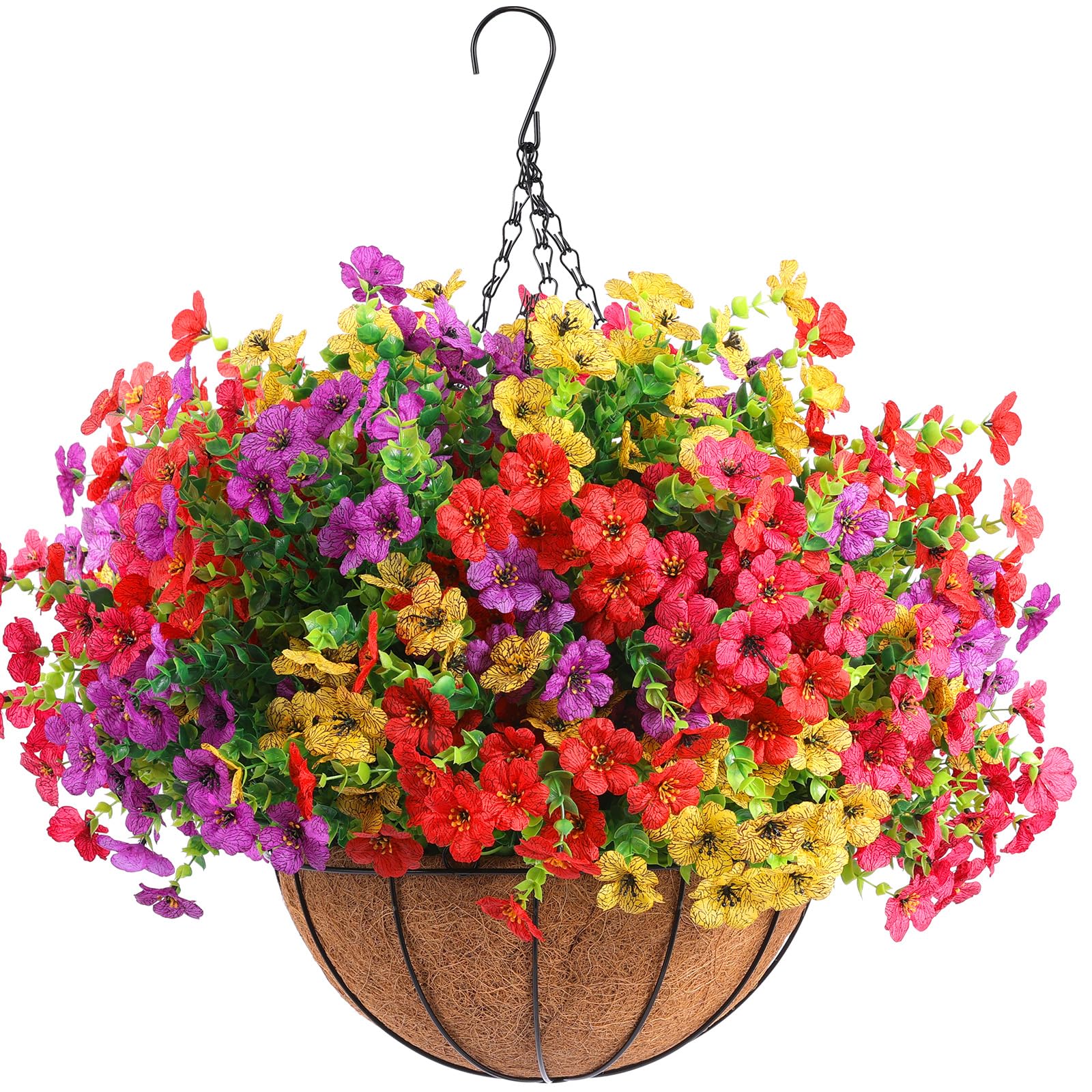 Hananona 2 Set Artificial Outdoor Flowers with Hanging Basket, 2 Hanging Planters with 24 Pcs Flowers for Spring Summer Front Porch Garden Patio Home Decor (2, Red, Purple, Yellow, Rose Red)