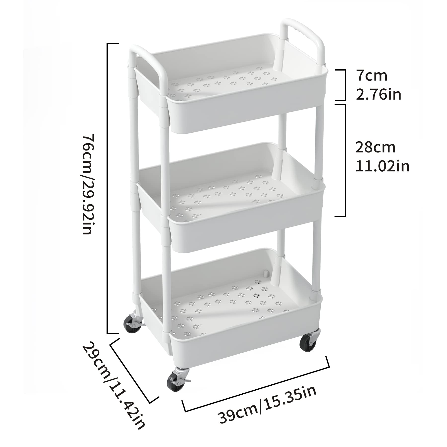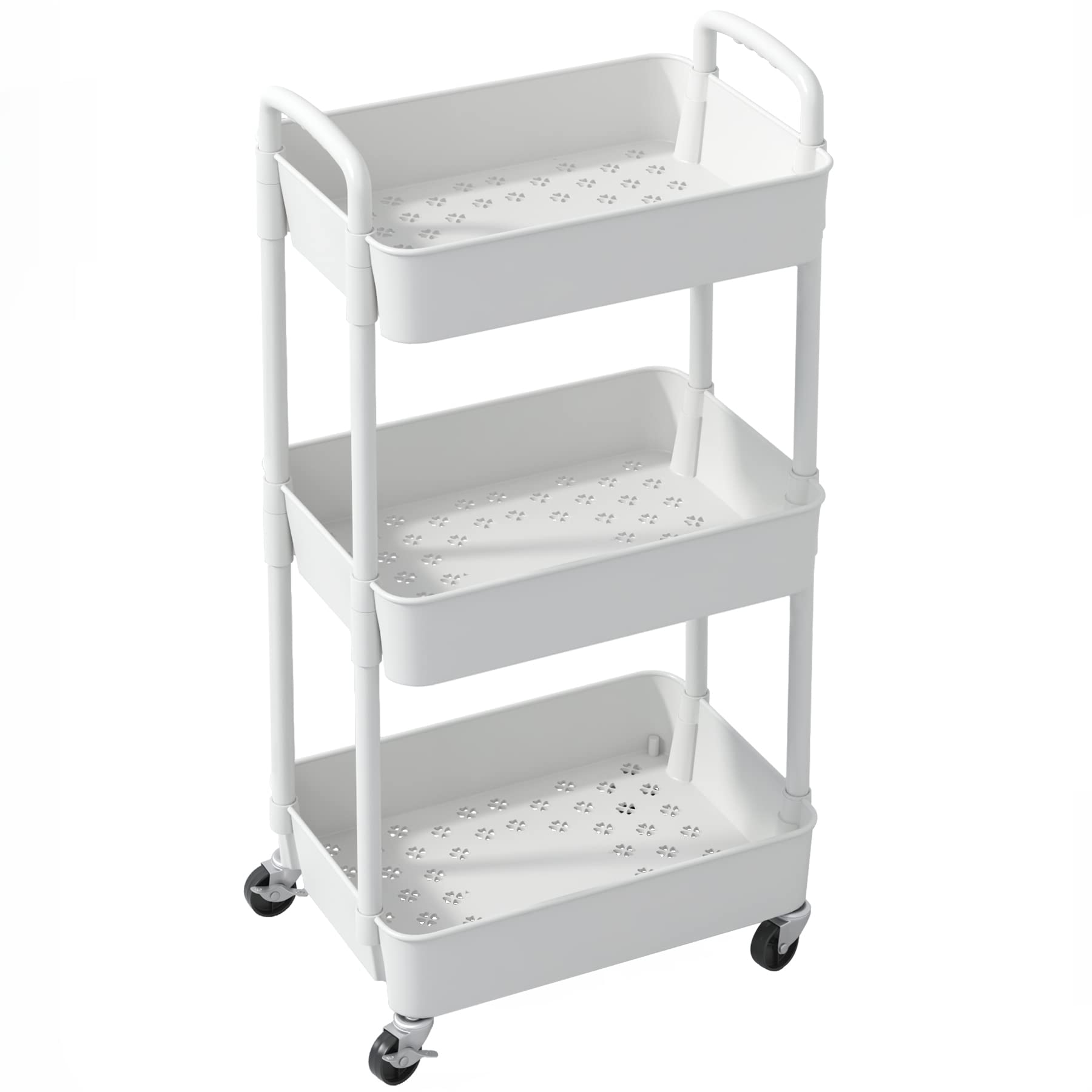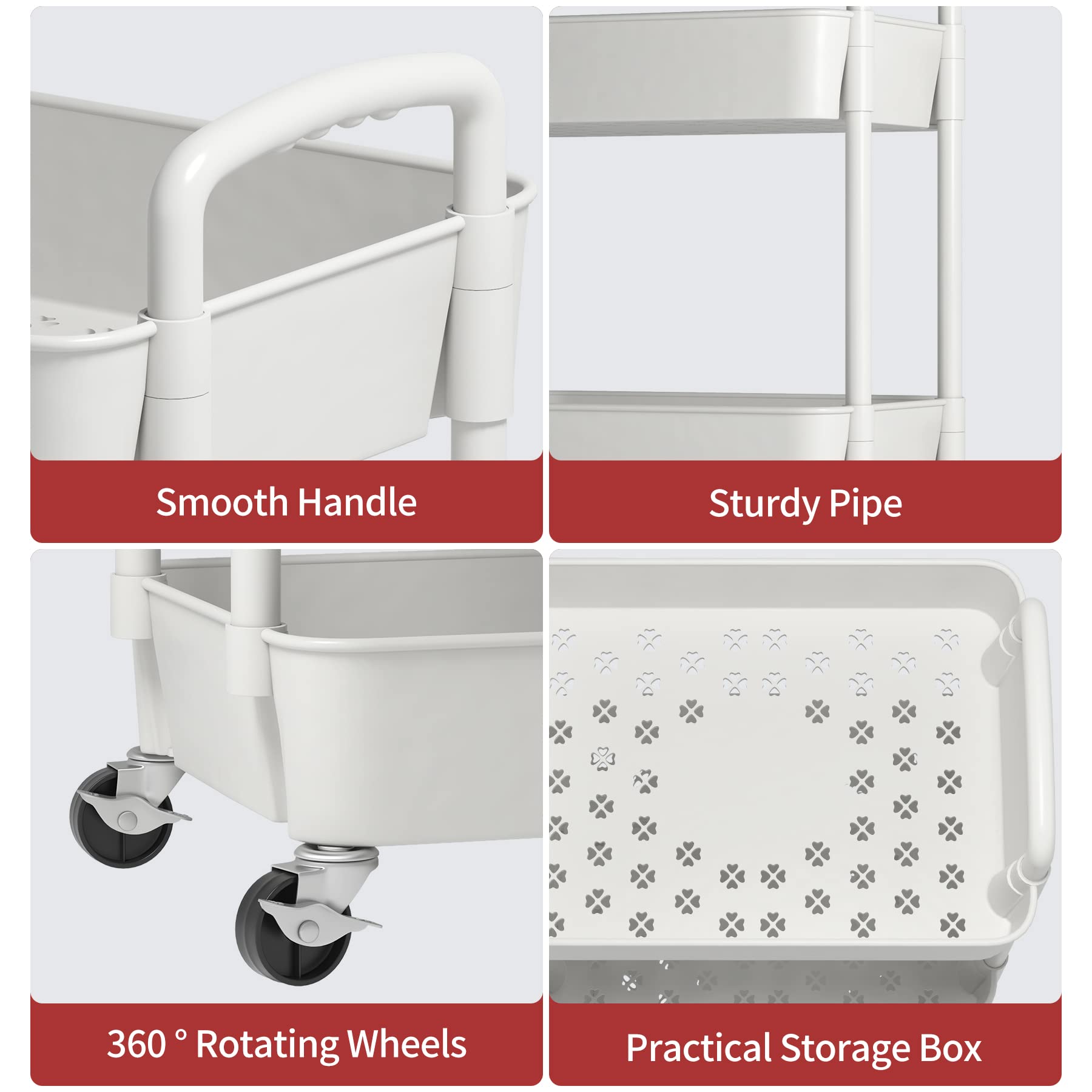 Sywhitta 3-Tier Plastic Rolling Utility Cart with Handle, Multi-Functional Storage Trolley for Office, Living Room, Kitchen, Movable Storage Organizer with Wheels, White